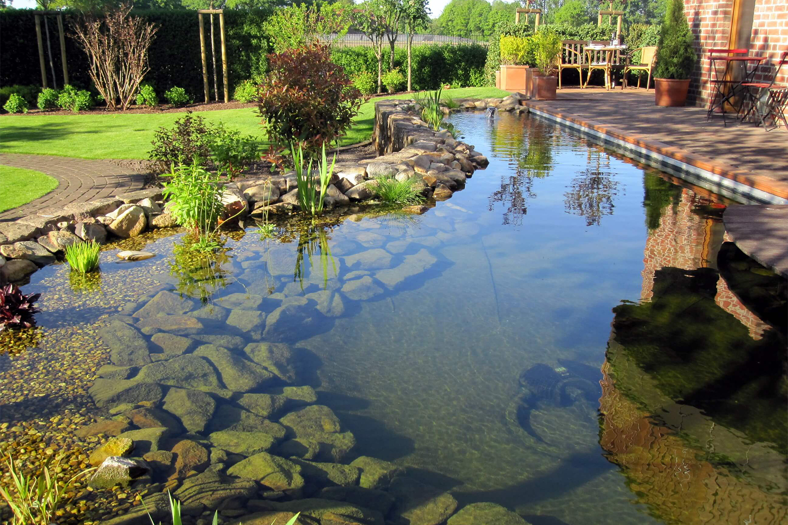 naturreich gestalteten Teichs. - Lassen Sie sich von den beruhigenden Klängen des plätschernden Wassers und der harmonischen Atmosphäre verzaubern.