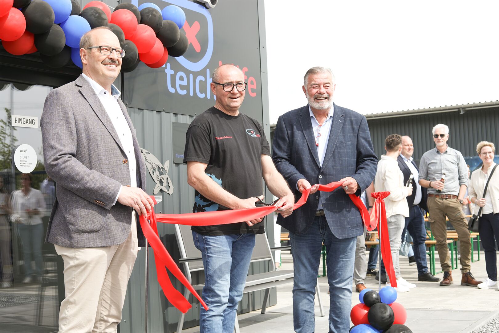 Die Vergrößerung des Unternehmens war notwendig geworden, und so haben wir im Gewerbegebiet Viehfeld ein neues, energetisch autarkes Systemgebäude auf über 1000 Quadratmetern Fläche errichtet. Ausgestattet mit einer Luftwärmepumpe und einer Solaranlage, liefert es zu 100 Prozent die benötigte Energie für den Betrieb. Unsere Kunden profitieren von einem einzigartigen Zentrum für Teichbau, Teichservice, Koi-Beratung und dem OASE-Kundendienst. Hier können wir modernste Technologien wie bildschirmgestützte 3D-Darstellungen für Teichplanung, Teich-Beratung anbieten. In unserer perfekt ausgestatteten modernen Werkstatt kümmern wir uns um die Reparatur von Teichtechnik von OASE. Im Außenbereich können unsere Kunden und Besucher eine Vielzahl von Wasserspielen, Teichen und bald auch einen Schwimmteich zur Veranschaulichung der Möglichkeiten live erleben.